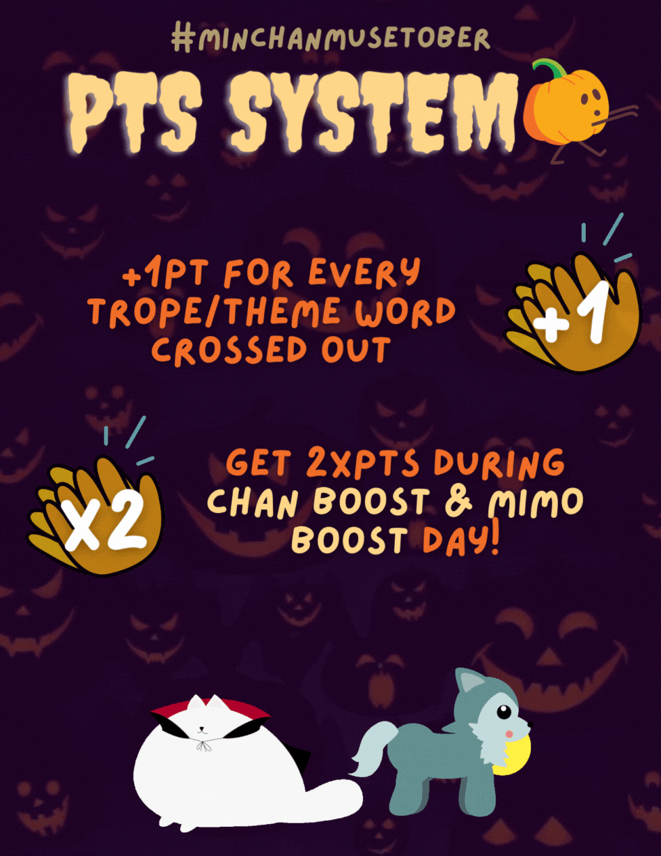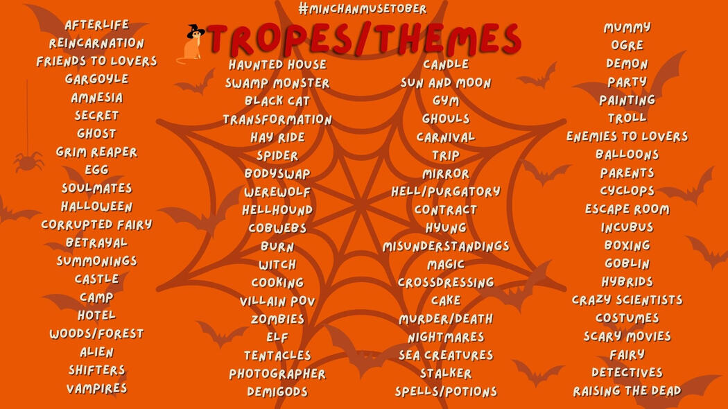 We can't just NOT celebrate MinChan month so we're here to bring you MINCHANMUSETOBER!MINCHANMUSETOBER is a spooktastic event for our favourite parents, Stray Kids' Bang Chan and Lee Minho.What better way to celebrate than to create as many or as little contents (fic/au, art, edit, etc.) using the tropes given, and keep on collecting points?!Keep on updated as we prepare for the spookiest celebration for MinChan month!